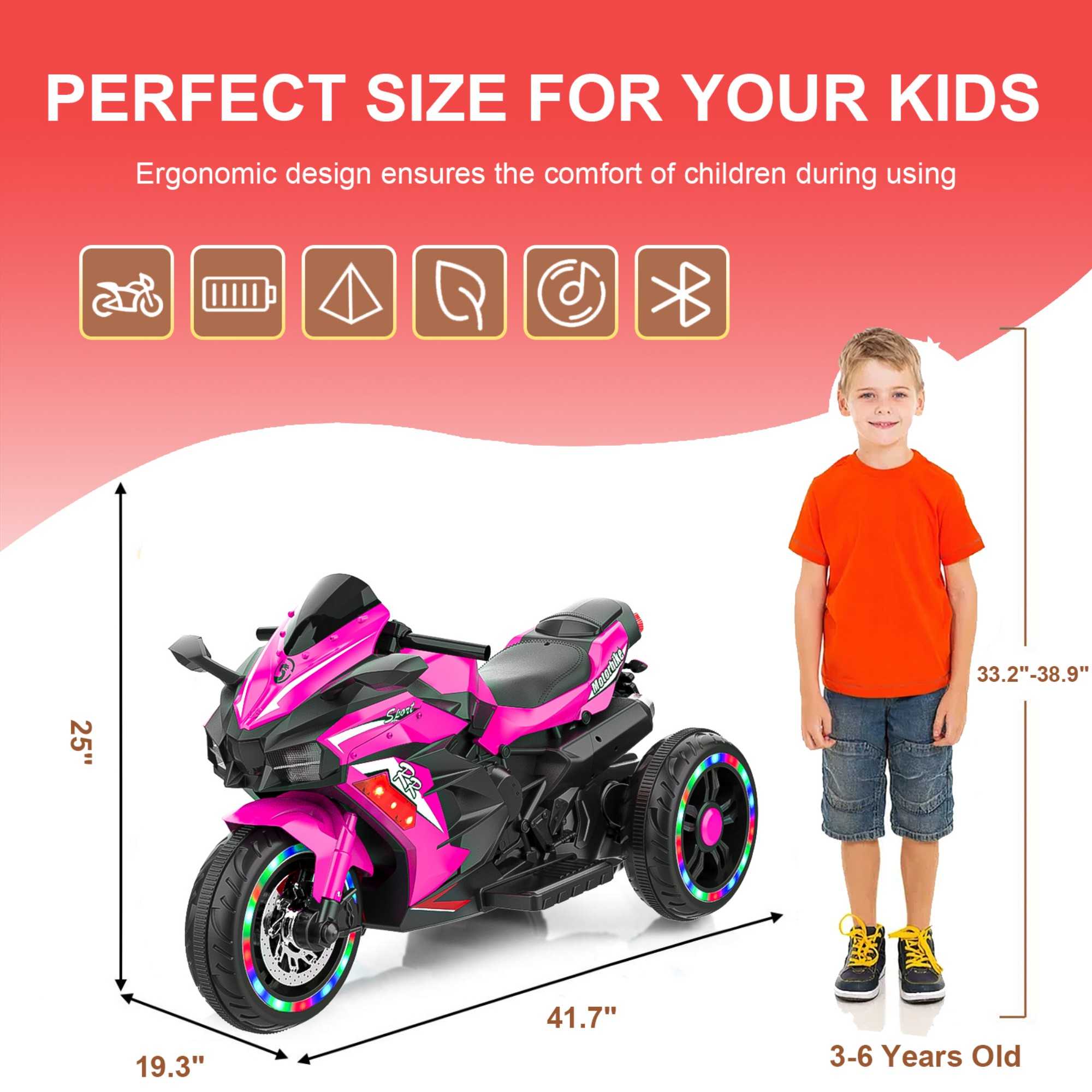 Designed for young adventurers, this **Motorcycle for Kids** features a speed range of 3-7 km/h, a sturdy build supporting up to 90 lbs, and a powerful 12V/7A battery with a 12V/45W motor for smooth rides.